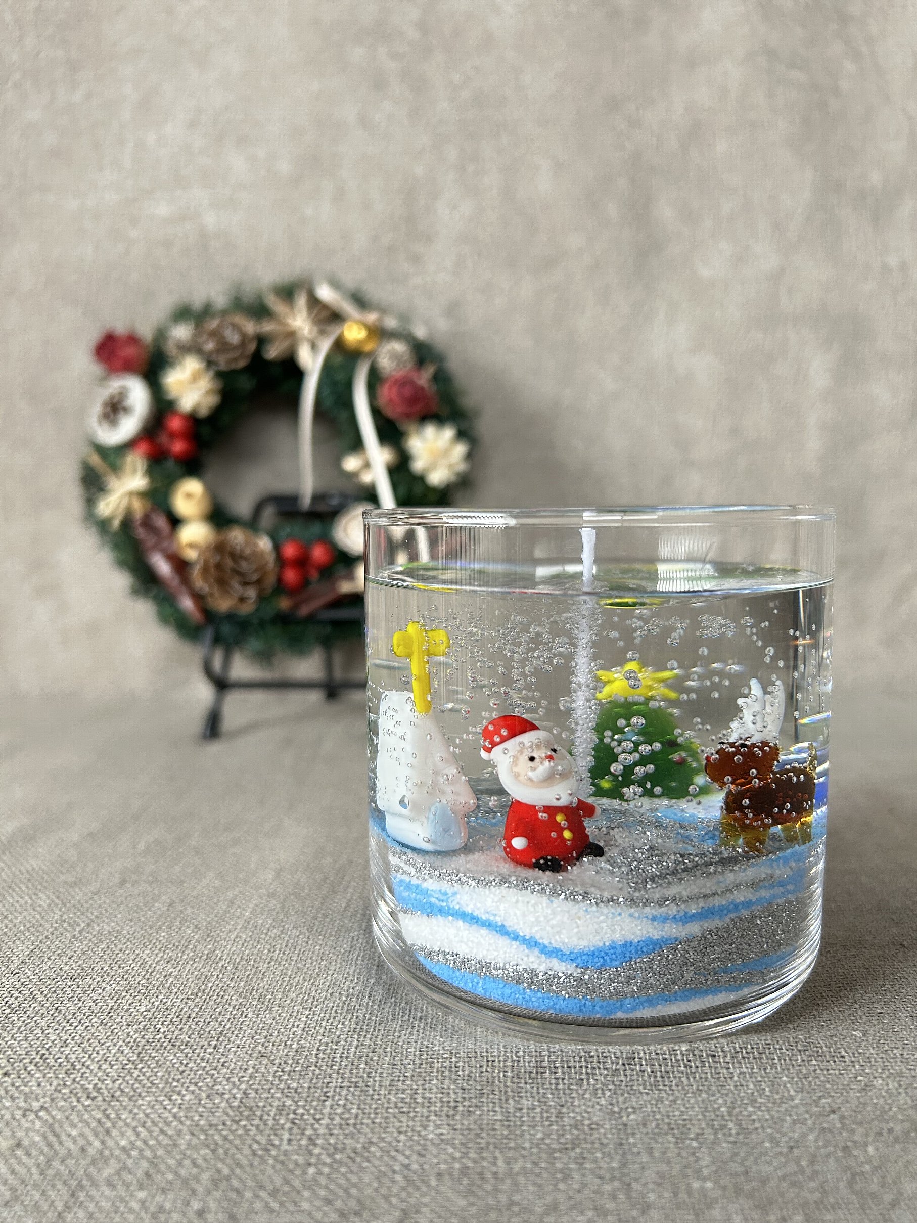 お好みの色の砂(カラーサンド)、4種類のクリスマスアイテムのガラス細工とビー玉で、クリスマスの景色を作ります。