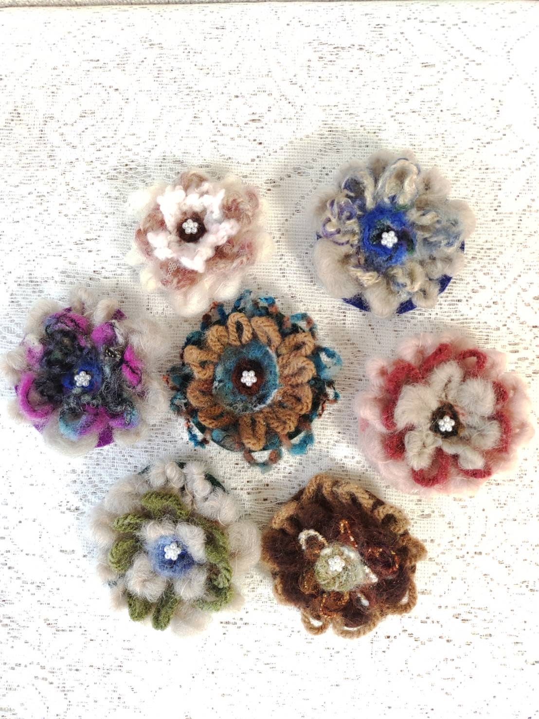 お好みの色の毛糸を選んで、オリジナルのニットブローチを作ります。