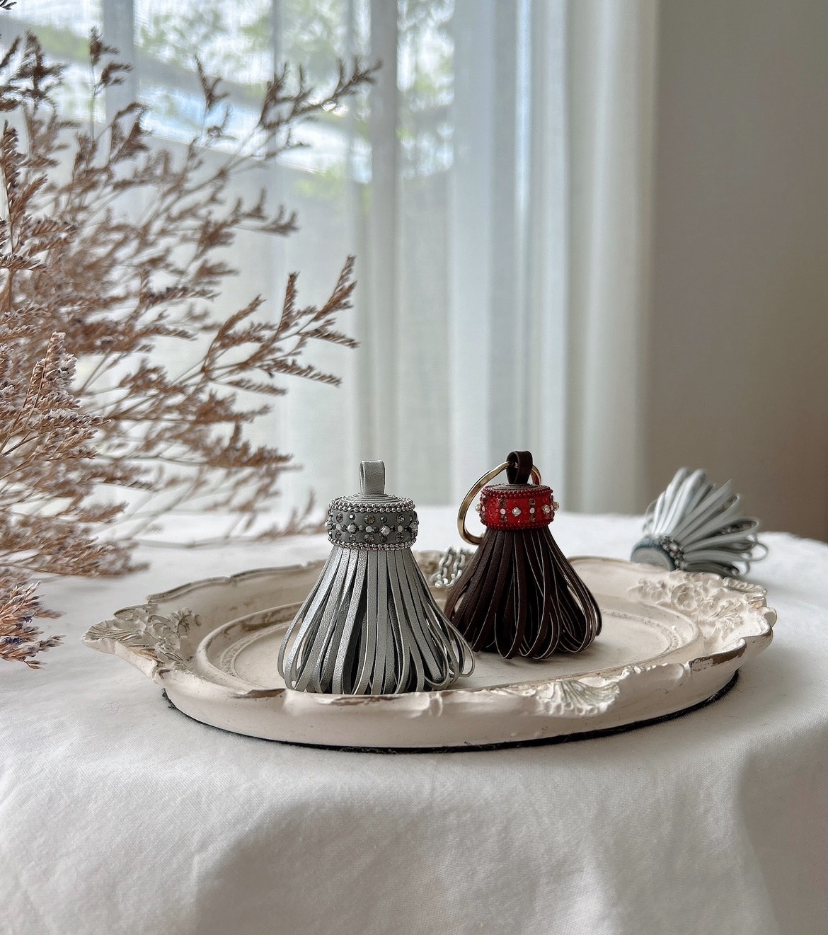 タッセルをシルバーかブラウンのどちらかから選び、グルーデコで模様をつけてバッグチャームを作ります。